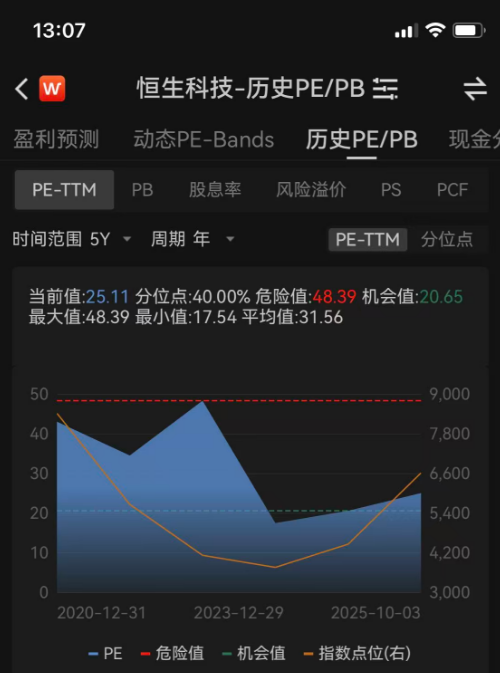 首先是估值。以恒生科技指数为例,在经历了过去五年的“深坑回调”,不少龙头甚至腰斩再腰斩。但估值是周期的基础,如今恒科指整体市盈率(PE-TTM)为25.11,处在近五年40%分位,哪怕经历了前段时间的涨幅也并不高。换句话说,现在布局,就像站在长期均值回归的大门口,风一吹,门就开了。