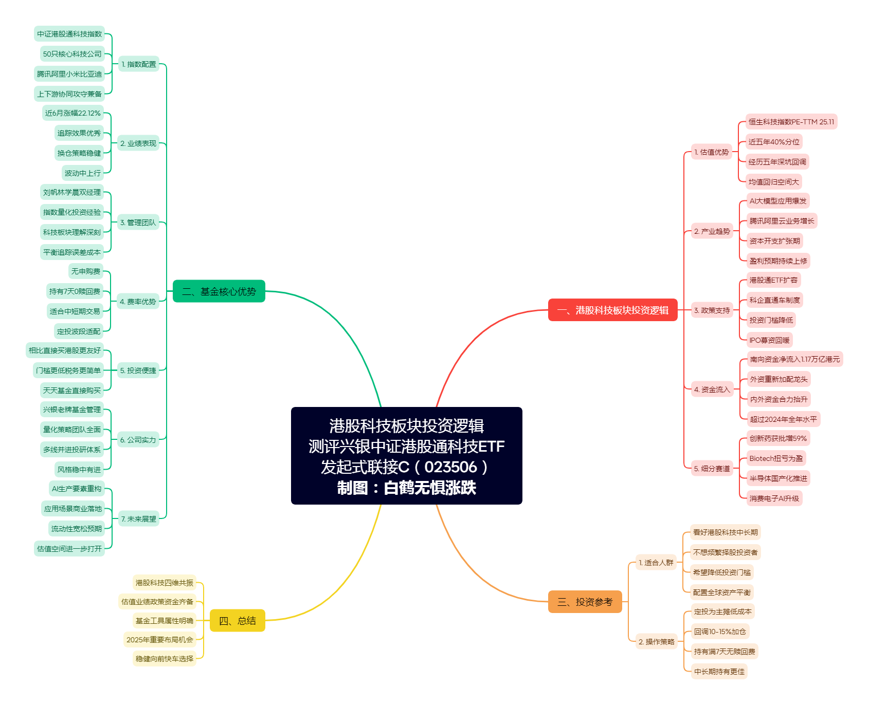 接下来白鹤君就具体谈谈自己对于港股科技板块的看法,并深度测评下兴银中证港股通科技ETF发起式联接C(023506)基金,文章有点长,这里也是做了个思维导图,方便大家整理思路,可以点开放大了看下的。
