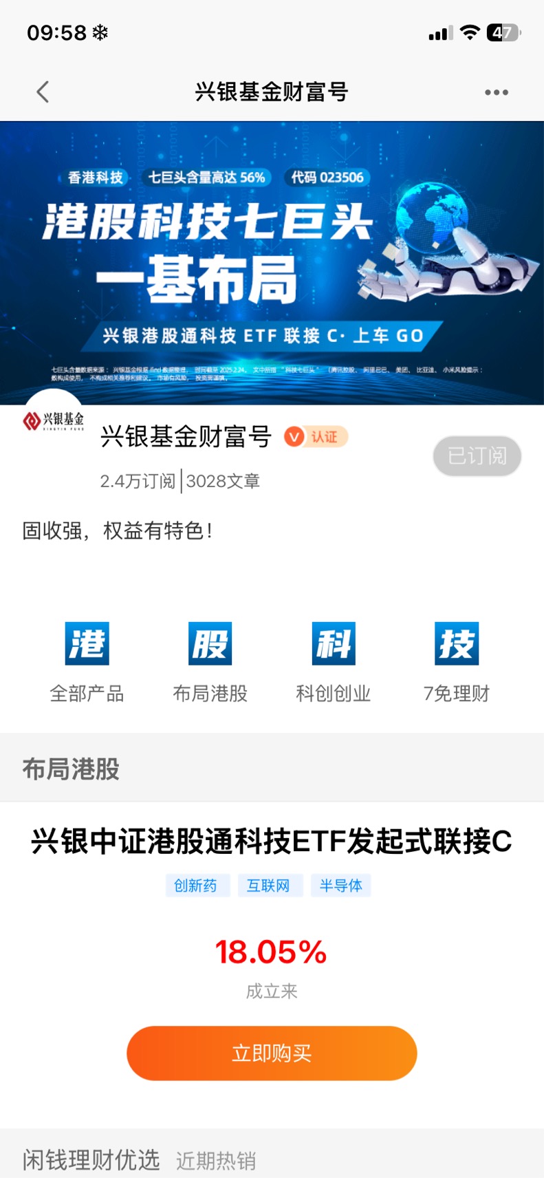 #我看好港股通科技未来的表现# #你看好港股通科技吗# $兴银中证港股通科技ETF发起式联接C$ 近六个月收益回报30.2%,在3734只同类基金中排名前列,表现非常亮眼!借基布局布局港股科技投资机会,伙伴们可以持续关注一下这只绩优联接基金。