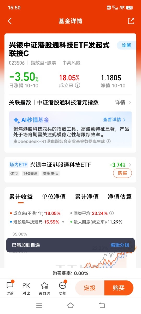 2023年末,我观察到港股通科技板块估值触底,但担心个股流动性风险,最终选择这款基金布局。2024年二季度,板块受政策利好提振开启上涨行情,我通过C类份额零申购费的优势追加仓位,既规避了直接投资港股的汇率波动风险,又享受了板块45%的涨幅。即便期间经历短期回调,基金的分散配置特性也有效控制了回撤,最终持仓收益远超预期。