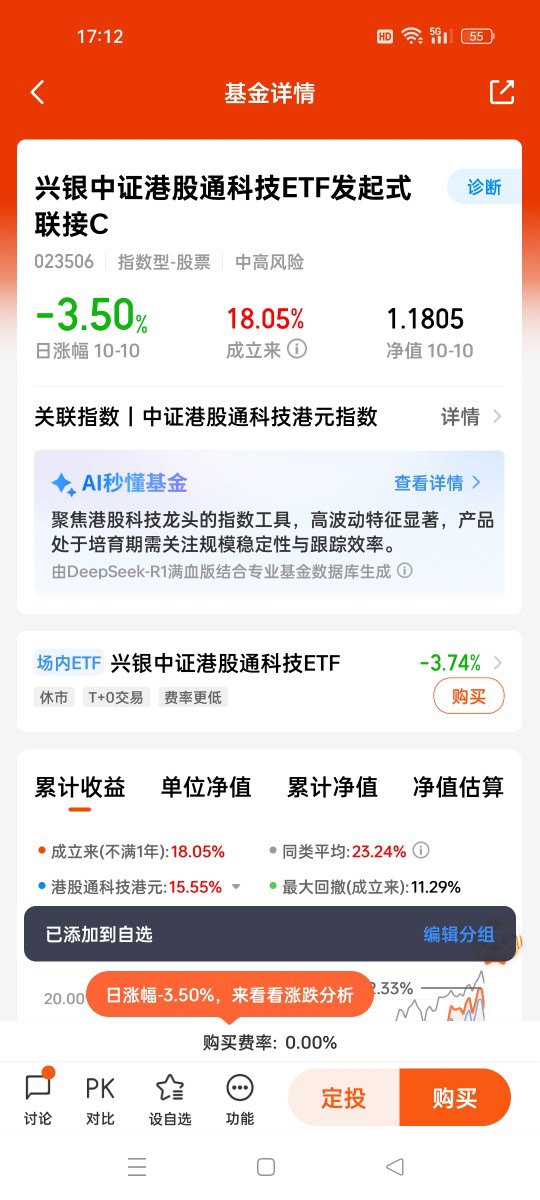 C类份额的费率设计更直击普通投资者痛点。该基金零申购费,持有满7天即可免赎回费,每年综合费率仅1%(含管理费0.5%、托管费0.1%、销售服务费0.4%),大幅降低了短期波段操作或长期定投的成本。对于没有港股账户的投资者而言,无需直面跨境交易门槛,通过普通基金账户即可参与港股科技龙头投资,这也是其成立后迅速获得资金关注的关键原因。