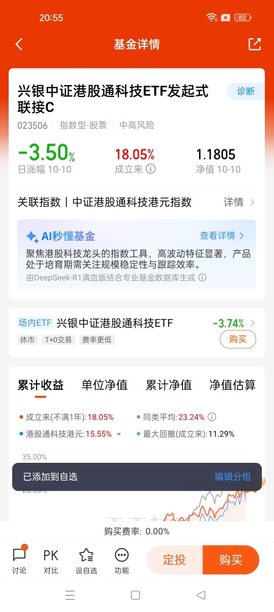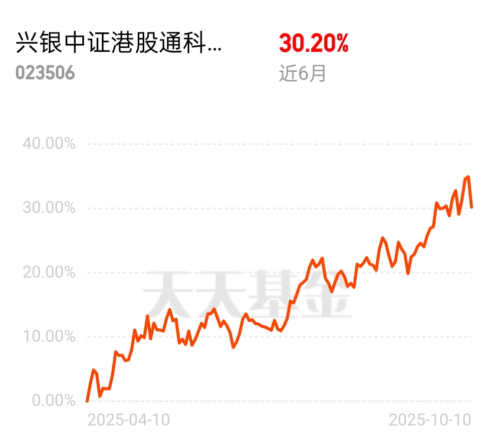 兴银中证港股通科技ETF联接C(023506)作为被动型指数基金,核心价值在于紧密跟踪中证港股通科技指数。该基金成立于 2025 年 3 月 24 日,最新净值 1.1805 元(10 月 10 日数据),近 6 个月波动率达 30.20%,符合 R4 中高风险等级定位。其投资组合中 90% 以上资产投向目标 ETF,剩余 5% 以上配置现金及短期国债,通过被动复制指数实现与标的指数的同步表现,日均跟踪偏离度控制在行业较低水平。