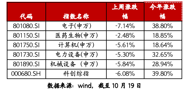 上周科技板块继续回调,科创综指下跌6.08%。各细分行业也均有不同程度下行,其中电子行业跌幅居前。