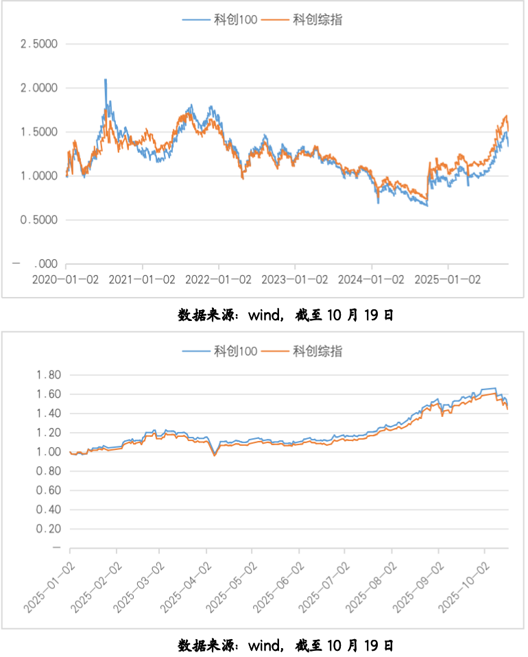上周科创100指数、科创综指指数均下跌。过去5年,上述2条指数自2020年7月高点以来总体下行,但2024年9月26以来迎来显著修复。截至今10月19日,科创100指数合计上涨33.53%,科创综指上涨50.85%。2025年截至10月19日,科创100指数上涨48.19%,科创综指上涨44.34%。