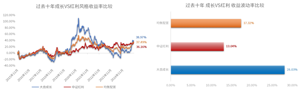 以过去十年为例,代表成长风格的大盘成长指数(399372.SZ)收益弹性较大,但波动也更大,而代表红利风格的中证红利指数(000922.CSI)则展现出波动较小的特点。如果均衡配置两种风格指数,或可有效控制组合波动,同时在市场行情进攻时力求获取更多弹性。
