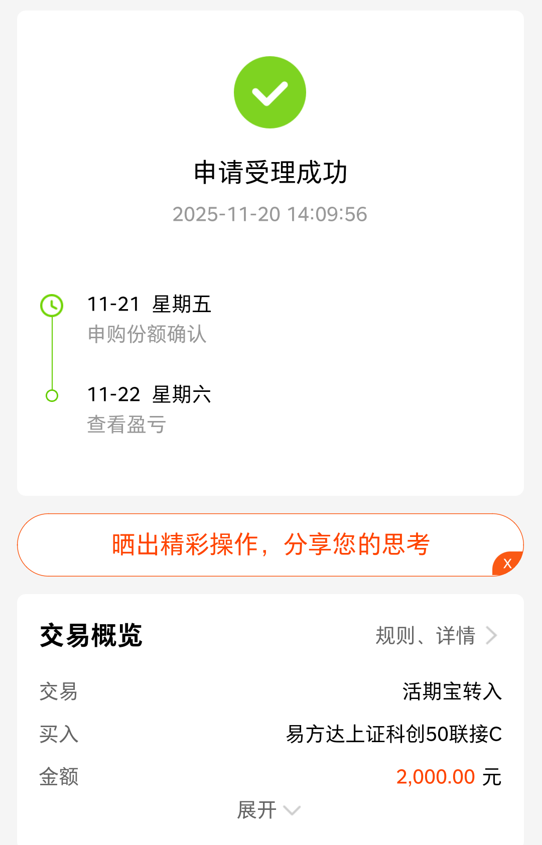今天股市行情上涨后回落,还是有些震荡,板块分化,轮动加快,我觉得配置宽基指数更有性价比,因为科技板块细分多,选择起来还是有些困难的,宽基指数式就可以避免这份烦脑。我加仓的是这只。