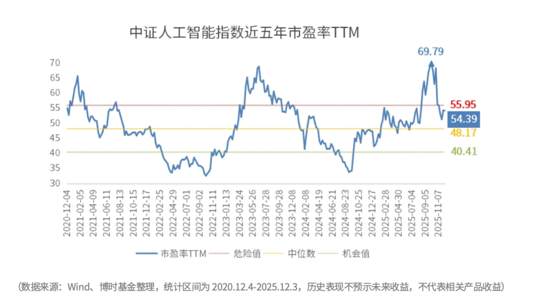 不可否认,从估值水平来看,当前A股AI板块估值并不“便宜”。以中证人工智能指数为例,截至2025年12月3日,指数市盈率TTM为54.39,虽较9月30日估值(市盈率TTM为69.79)有所回落,但仍处于近五年75.56%分位。
