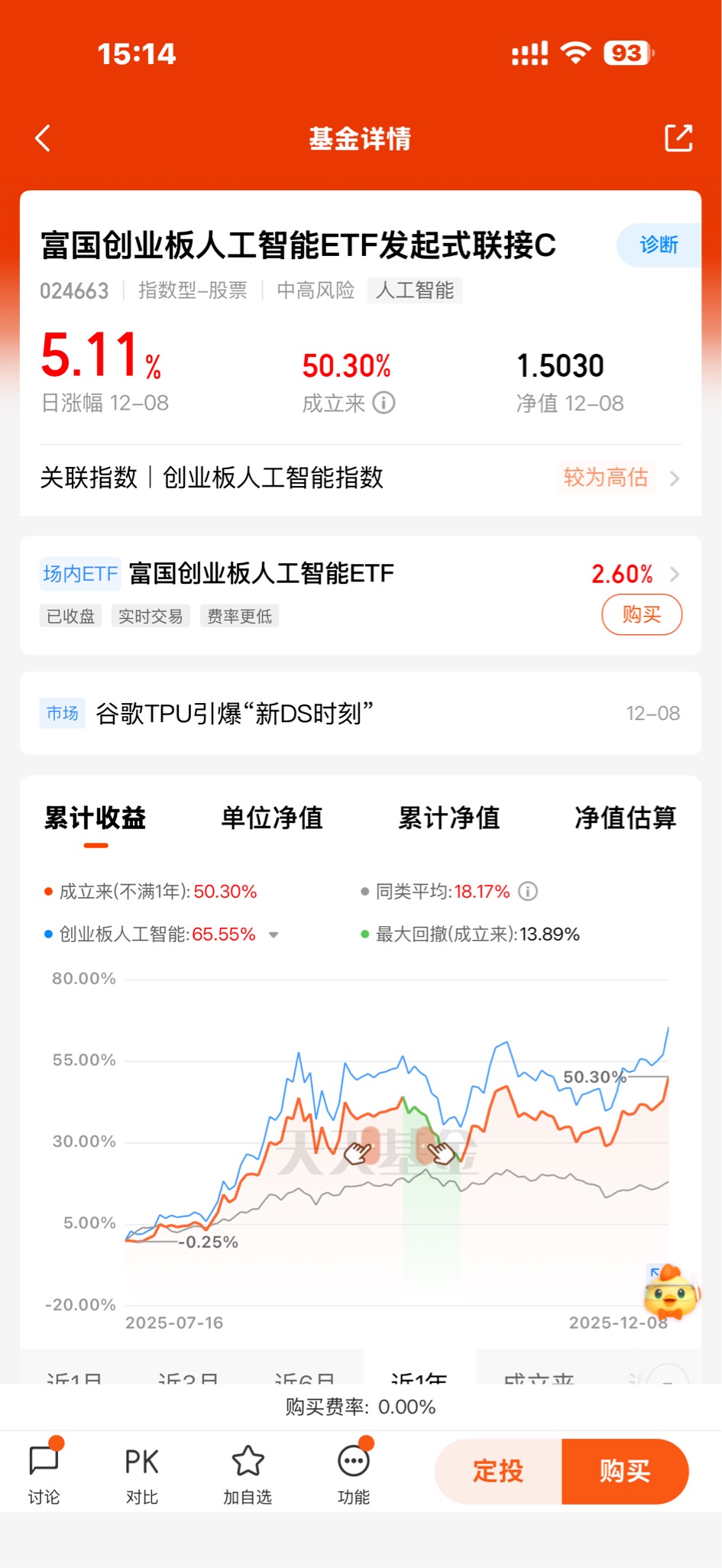 这段时间博时科创板AI一直没起色,转而加了点富国创业板人工智能ETF联接C,连涨
