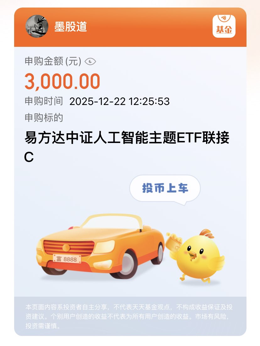 今日早盘高开后全天震荡盘整,稳稳站上 3900 点,量能略有放量。美股 AI 板块在质疑声中波动,券商争论加剧,好在美光科技强劲财报点燃乐观情绪,板块短暂止跌回升。想省心布局科技赛道,易方达中证人工智能主题联接 C 值得入手,我先上车 1 万元。这只基金一键打包大数据龙头,近一年涨 51.67%,远超同类平均 23.63% 的收益,实打实的超额回报。