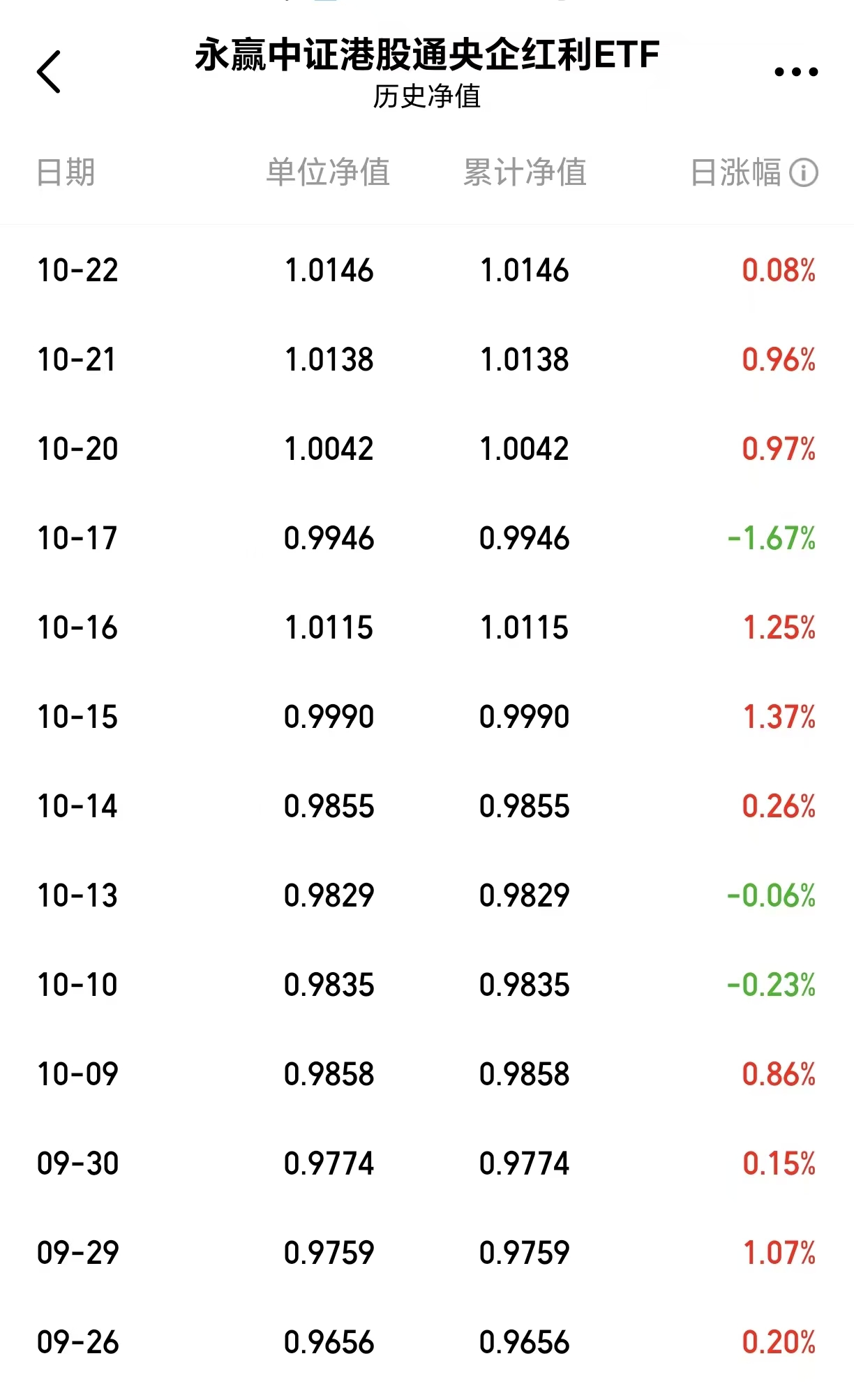 近期市场频繁回调,红利类资产越来越受关注。我看永赢中证港股通央企红利ETF及$永赢中证港股通央企红利ETF联接C$(A类:023534/C类:023535)就挺不错的,最近的13天里有10天都是上涨的,这市场能有稳稳的收益就挺好。