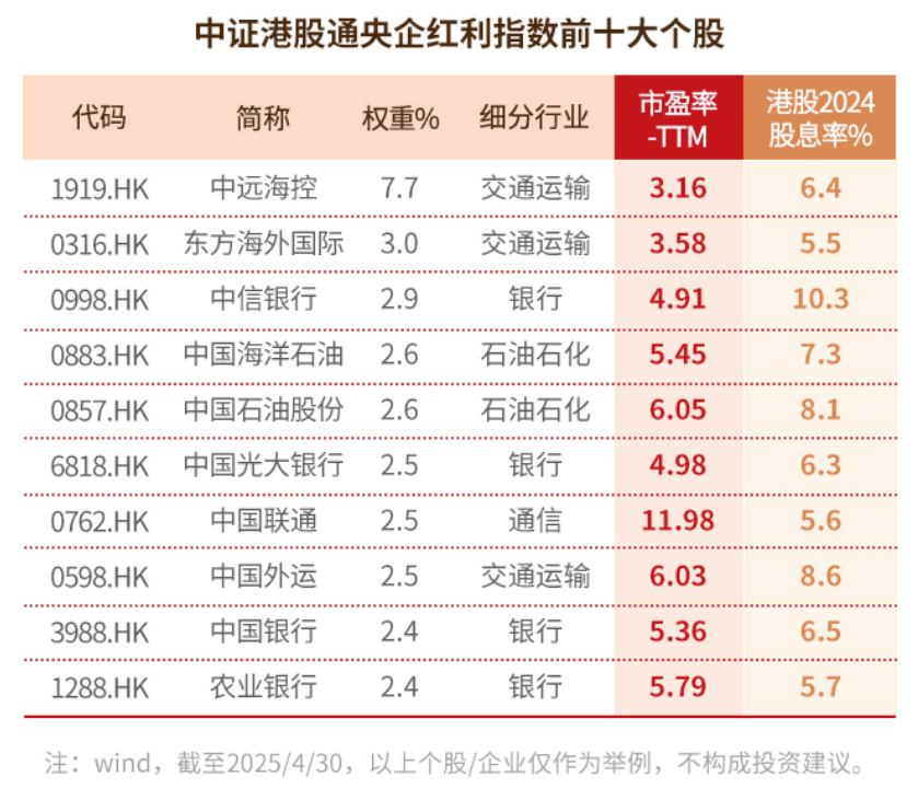 如今央企股票正以高股息名重塑市场认知。永赢中证港股通央企红利ETF及$永赢中证港股通央企红利ETF联接C$(A类:023534/C类:023535)所代表的资产逻辑:当市场不确定性加剧时,能稳定分红的低估值央企,正在成为资金的“诺亚方舟”。该ETF跟踪的中证港股通央企红利指数,前十大重仓股平均市盈率5倍、股息率7%,相当于用买白菜的价格买黄金,这种价值洼地效应正在被资金快速填平。