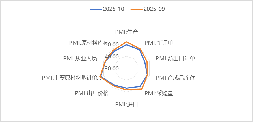 今日国家统计局公布10月份PMI数据,10月制造业PMI 49.0%(环比-0.8pct),连续两个月位于收缩区间;非制造业商务活动指数50.1%(+0.1pct),仅勉强扩张;综合PMI50.0%(-0.6pct),经济整体呈现“制造业降温、服务业稳而不强”的弱平衡特征。(数据来源:国家统计局)