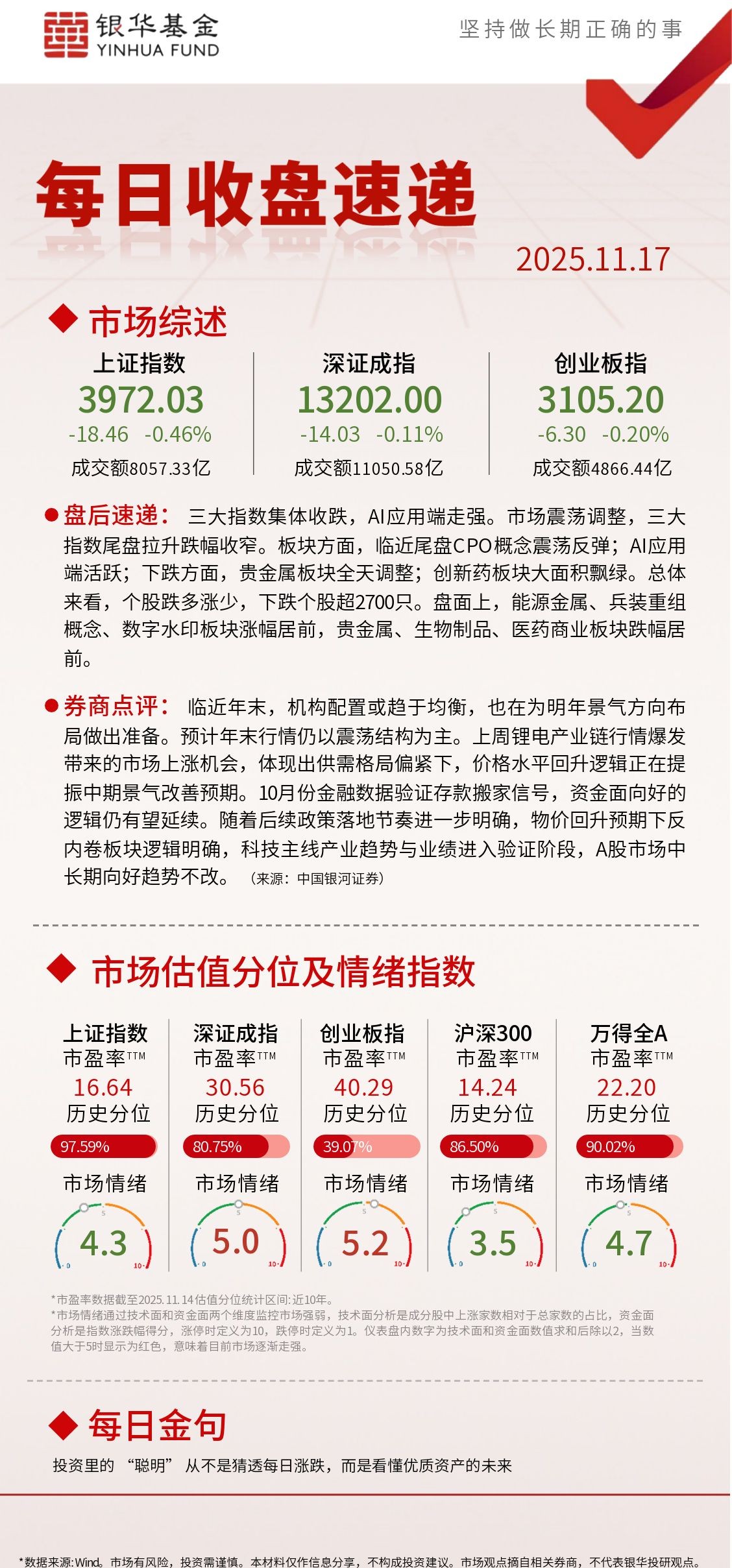 每日收盘速递 | 2025.11.17 三大指数集体收跌,AI应用端走强