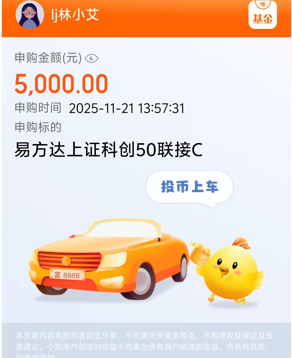 昨日外盘震荡大跌,今日早盘我A受其影响三大指数集体调整,科技板块受市场影响也集体回调,给了我们加仓的好机会,所以我今天打算发车5000元的易方达科创50联接C,这个基跟踪的是科创50,里面包含了AI、半导体、芯片等科技板块的龙头企业,在震荡行情下,我觉得入手宽基比压单一板块更让人安心。