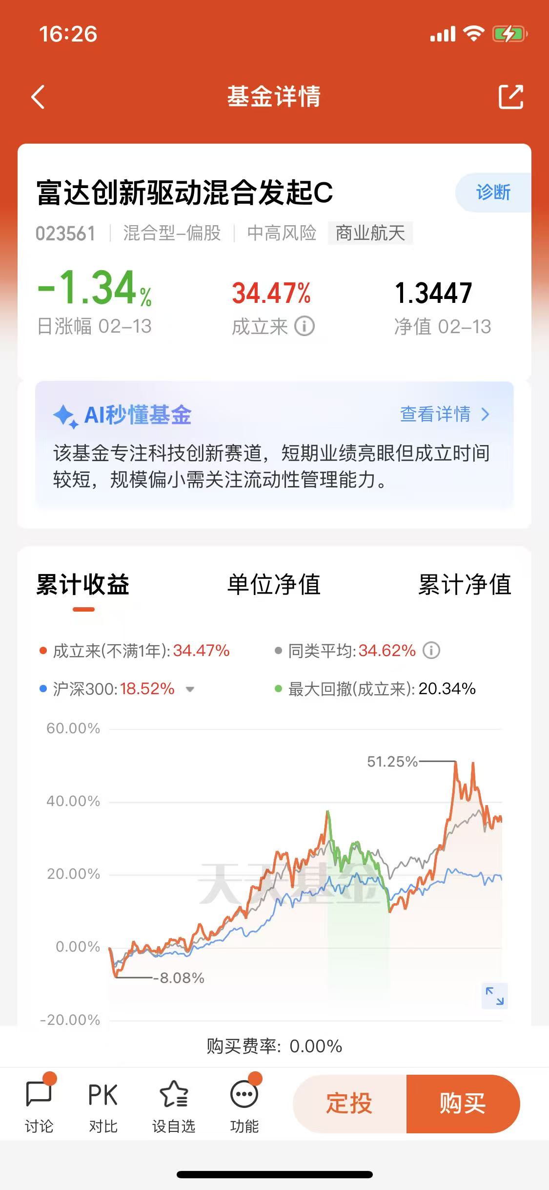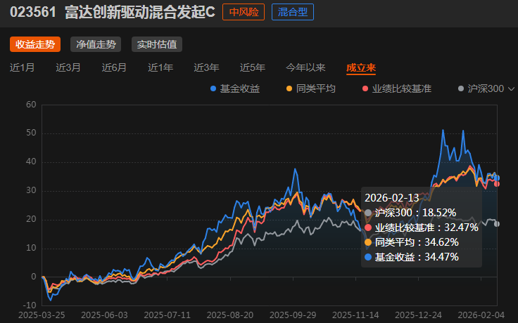 当然,虽然我对后市持乐观态度,但投资市场轮动快的特点不会改变,普通人想靠自己踩准每一个细分热点,难度极大,与其浪费精力追涨杀跌,不如找一款能精准贴合主线、布局全面的基金,把专业的事交给专业的人,这才是今年跟上市场节奏的好选择,而富达创新驱动混合发起C(023561)就非常不错。