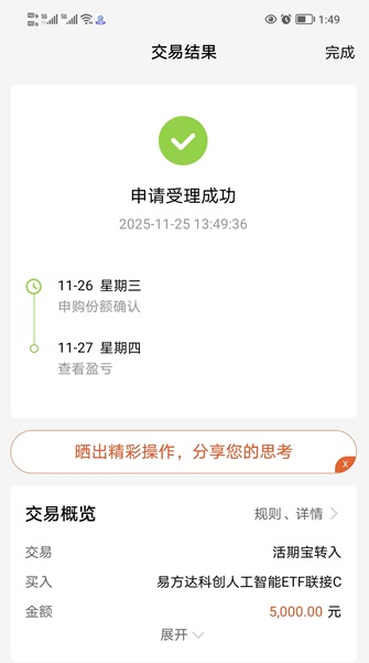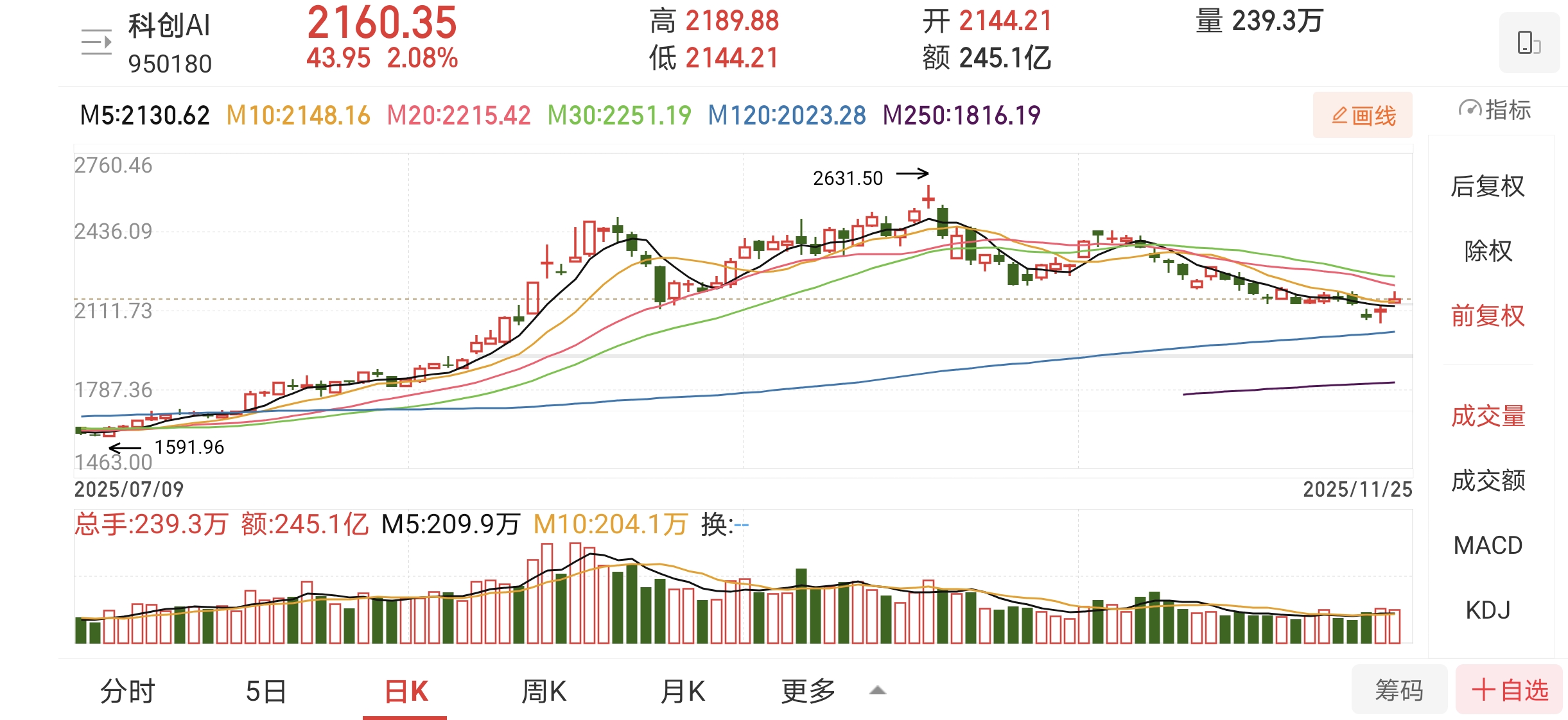 科创AI:我今天继续加仓$易方达科创人工智能ETF联接C(OTCFUND|023565)$5000元。这支基金是紧密跟踪科创AI指数(950180)。该指数聚焦上证科创板人工智能领域核心资产,占比前五的是澜起科技、金山办公、寒武纪、芯源股份、石头科技,今天都有很不错的反弹。指数近2年大涨83.41%,近1年涨55.32%,近6月涨29.25%,中长期成长性非常不错。近1月回撤了11.68%,可见十月以来,市场因为担心美股科技算力AI的泡沫问题,全球人工智能产业链都经历了较大的调整。英伟达上周发布了第三季度财报,业绩大超预期,同时算力中心在为其核心资产,增长非常强劲。昨晚美股科技全面反弹,今天A股算力CPO、人工智能方向也是集体强势归来。本指数今天目前涨2.74%,再次走出一根中阳线,成功收复了5天10天均线,还有望反包收复上周四的大阴线。展望未来,受益于整个人工智能产业的快速发展,科创AI国产替代成为历史大趋势。我一直坚持认为,科创人工智能算力CPO只有阶段的调整,不会有中长趋势的下跌,我决定继续加仓本基金,我认为科创AI新一轮的行情已经启动。