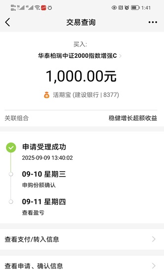 3.中证2000:我今天继续加仓$华泰柏瑞中证2000指数增强C(OTCFUND|019924)$ 1000元,这支基金是中证2000指数增强型基金。中证2000指数从沪深市场中选取市值规模较小且流动性较好的2000只证券作为指数本样。本基金通过增强策略,近1年涨105.93%,近6月涨29%,近3月涨22.85%,近1月涨6.52%,各时间周期对比目标指数都有明显的超额收益,尤其近1年,超额涨幅达到了27.65%,超额收益非常优秀,充分说明了该基金采用的增强策略是非常有效的。现在A股大盘在高位震荡,成交量稳定在2万亿以上,资金交投活跃,对小微股非常友好。根据我十几年的投资经验来看,目前情况是非常适合布局小微盘股的,今天趁着小幅回调大力低吸本基金,牢牢把握这波行情。下面我晒一下买入操作记录: