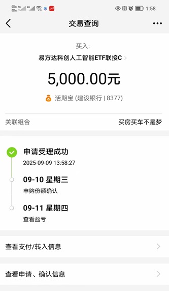 1.科创人工智能:我今天新建仓$易方达科创人工智能ETF联接C(OTCFUND|023565)$ 5000元。这支基金是上证科创板人工智能指数(简称科创AI,代码950180)ETF联接基金。该指数聚焦上证科创板人工智能领域核心资产,成分股集中于半导体、算法框架、智能终端等硬科技领域。科创人工智能近一年涨151.31%,近3月涨33.09%,近1月涨23.52%,业绩优于中证人工智能指数。展望未来,受益于整个人工智能产业的快速发展,科创人工智能涨势很好,国产替代成为历史大趋势。上周四指数大阴线调整,回踩20天均线获得有效支撑,周五踩着20天均线向上拉出一根实体阳线,昨天与今天指数连续走出两根红十字星,上影线触及5天均线,下影线触及20天均线,我认为是止跌反弹的明确信号。今天正是低吸二次进场的好时机,我决定建仓本基金,我认为科创人工智能的行情还远没有结束。下面我晒一下买入操作记录: