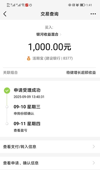 2.偏债基金:我今天新建仓$银河收益混合(OTCFUND|151002)$ 2000元。这是一支偏债基金,也可以称为“固收+”基金,目前配置了12.08%的股票,主要布局了CPO为代表的科技高成长赛道和银行为首的红利低波两个方向,攻守两端两手抓。债券类占比约90%,主要布局了信用债,提供票息安全垫,组合修正久期约3年,低于长债基金平均水平,利率风险敞口可控。本基金近1年涨11.83%,近3月涨8.32%,近1月涨6.85%,作为一支“固收+”产品,这收益能力表现十分出色。现在A股科技成长在高位震荡,短期资金在玩高低切,我觉得适当布局偏债基金,进可攻,不至于完全踏空,退亦可守,不必天天提心吊胆,确实是不错的选择,因此我今天决定建仓本基金,把它作为账户安全垫,中长期配置。下面我晒一下买入操作记录:
