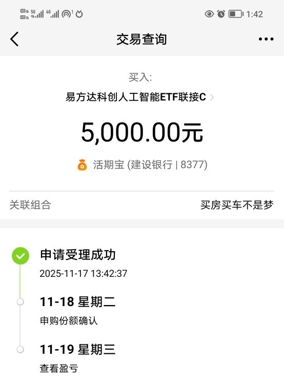 消息面上,华为11月21日将发布AI领域的突破性技术,有望解决算力资源利用效率的难题。今天人工智能逆市上涨,表现明显强于大盘整体,我看好其接下来的表现,决定继续加仓$易方达科创人工智能ETF联接C$5000元,累计持仓超5万元了 。最后我晒一下买入操作记录: