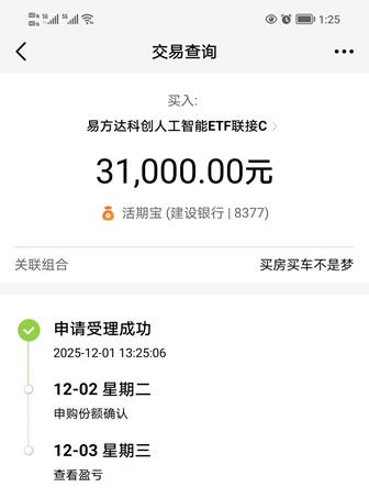 展望未来,受益于整个人工智能产业的快速发展,科创AI国产替代成为我们发展的必经之路。我一直坚持认为,科创人工智能是一个新兴行业,具有很好的成长性,只有阶段的调整,不会有中长趋势的下跌。我今天决定大力加仓本基金,我认为科创人工智能新一轮的行情已经启动。下面我晒一下买入操作记录: