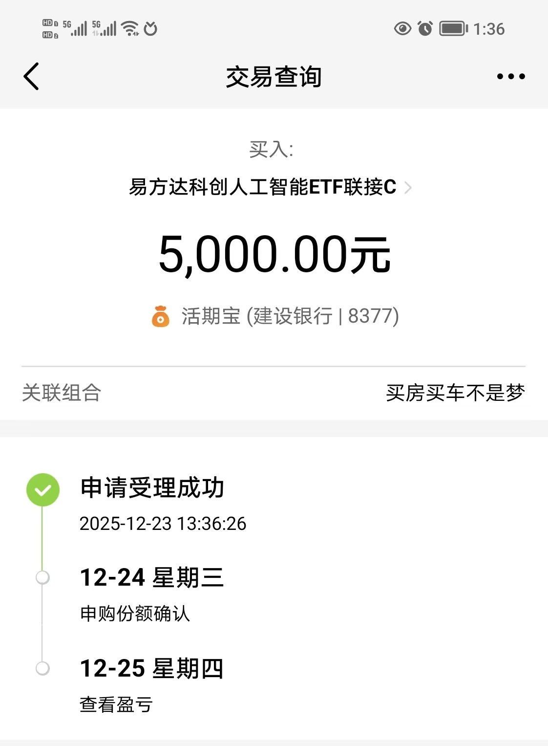 1.科创人工智能:我今天继续大力加仓$易方达科创人工智能ETF联接C(OTCFUND|023565)$5000元。这支基金是紧密跟踪科创板人工智能指数(950180)。该指数聚焦上证科创板人工智能领域核心资产,寒武纪、澜起科技、金山办公、芯源股份等四支占比超10%,今天表现都很不错,寒王目前涨近4%,表现强势,其它三只也全都红盘。指数今天冲高回落,目前小涨0.24%,上影线触及了20天均线,充分释放抛压。实体处于10天均线位置,下影线回踩5天均线获得了强支撑。5天均线已经明显拐头向上,即将与10天均线粘合金叉,会对指数接下来反弹形成强支撑。从上周开始,美科技股AI泡沫的忧虑情绪逐渐退潮,英伟达、美光科技等持续强势反弹。A股人工智能方向资金也是非常活跃,摩尔线程、沐曦股份新股上市获得资金追捧。展望未来,受益于整个人工智能产业的快速发展,科创AI国产替代成为我们发展的必经之路。这个方向只有阶段的调整,不会有中长趋势的下跌。最近科创人工智能指数明显企稳回升,我趁着还在反弹初期继续大力加仓本基金,坚定做多科创人工智能方向。下面我晒一下买入操作记录: