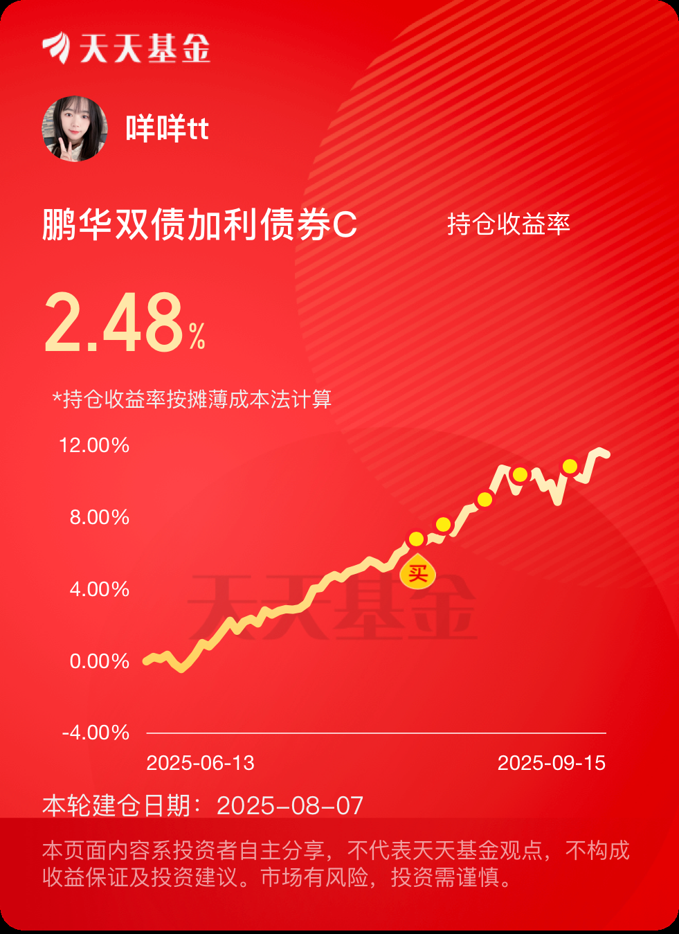 固收+:大盘3800点上方,还没上车或者轻仓的朋友眼馋又怕追高站岗,求稳又不想踏空我觉得固收+就是个不错的选择。固收+我投的是$鹏华双债加利债券C(OTCFUND|013149)$,今天我再加2000元进来。