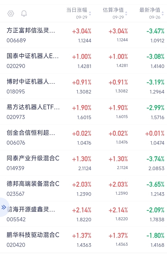 机器人真进白宫了,这事儿太有标志性了!以前觉得人形机器人离生活很远,现在发现它可能比自动驾驶来得更快。特斯拉用电动车积累的数据和工程能力,直接迁移到机器人上,效率极高。国内也在搞“机器人+制造”“机器人+养老”,应用场景不断拓宽,整个赛道正迎来戴维斯双击,乐观预期持续升温。方正信泓上涨了3.97%,$德邦高端装备混合发起式C$ 上涨了3.14%,$前海开源盛鑫混合C$