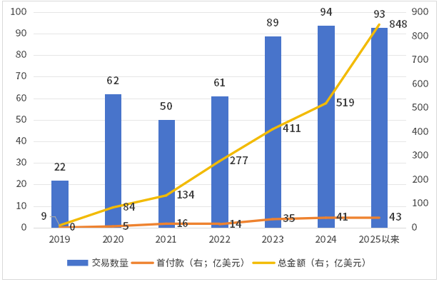 于是,我们也就能看到,近两年跨国药企展开了对中国创新药的追逐。数据显示,中国License-out数量自2020年开始大幅增加,近两年涨势更甚,仅2025年以来已达93笔,总金额848亿美元,首付款与总金额均已超过去年全年总额。