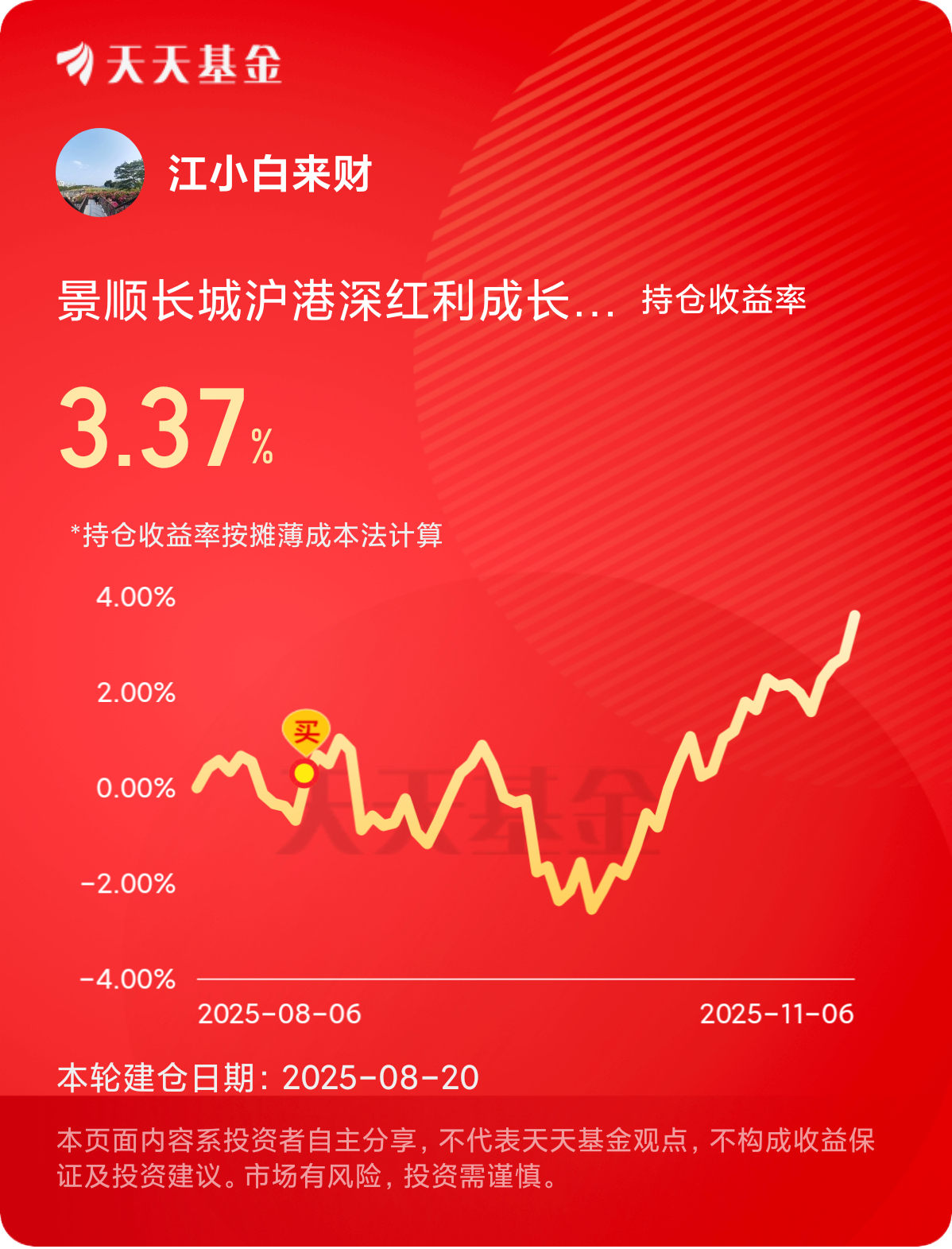 红利最近真的很可以诶,连红4天了、继续创新高!拿住就是机会$景顺长城沪港深红利成长低波指数E$ #晒收益#