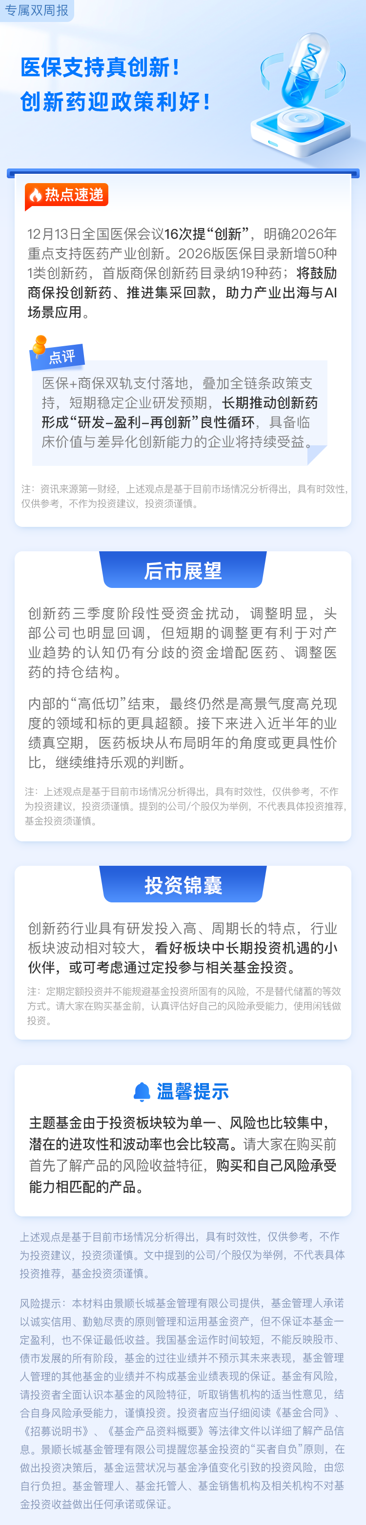 12月13日全国医保工作会议释放重磅信号——“创新”被提及16次!明确医保既是民生保障,更是引导医药产业升级、支持新质生产力的战略买方。展望后市,创新药投资怎么看?速看周报,查阅解析~
