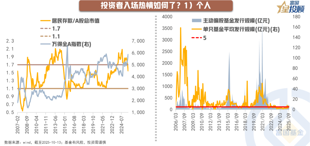首先,若是从“居民存款/A股总市值”看,目前这一比值仍在1.7的历史高位,距离1.1左右的历史低位,仍有较大空间,这也就意味着“存款搬家入市”远未结束。其次,从新基金发行看,9月主动权益基金的总发行规模为169亿元,单只基金的发行规模仅5.4亿元,均位于历史低位。从历史规律看,市场存在“反新基魔咒”,即当新基金发行过热时,市场会有调整压力,当新基金发行遇冷时,反而不需要特别悲观。