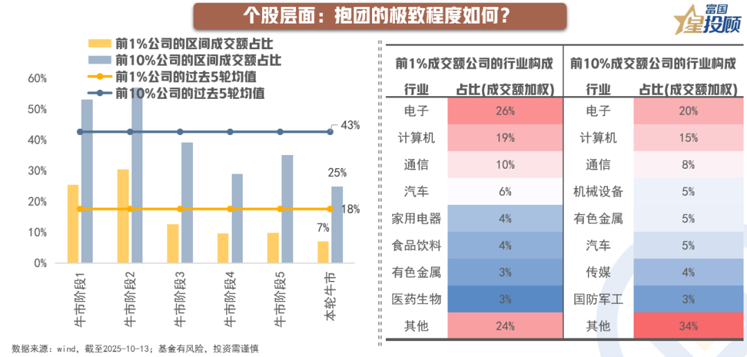 若是从去年“924”以来的个股成交情况看,前1%、前10%公司的成交额占比分别为7%、25%,相对过去5轮牛市的均值水平18%、43%相距甚远,这也就意味着当下的个股交易拥挤度并未达到过热的状态。具体来看,交易热度较高的个股主要集中在电子、计算机、通信行业。