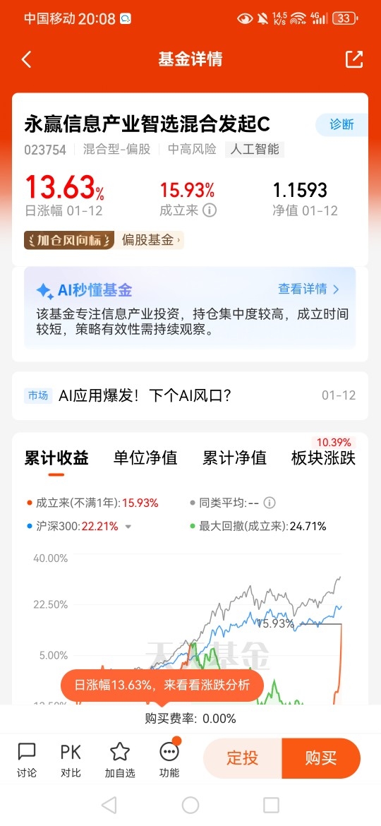 $永赢信息产业智选混合发起C$刚成立不久,今日更是大涨12个多点,AI应用的投资