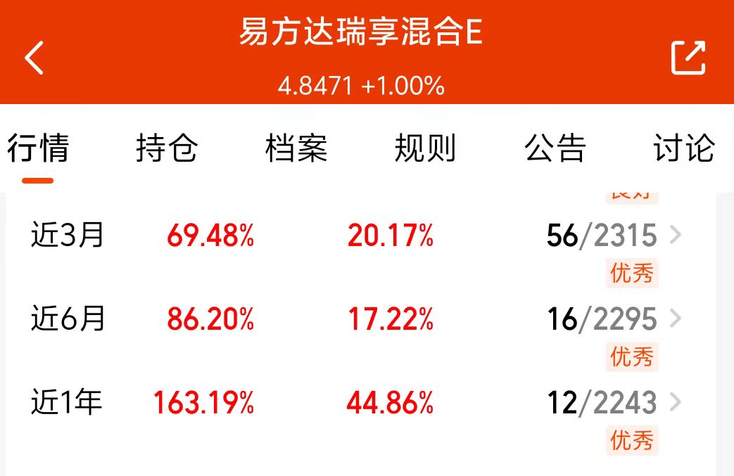 午盘市场风格突变,又给了倒车接人的机会,当前行情我还是继续看好科技赛道,像我持有的$易方达瑞享混合E$ 001438这个基聚焦科技下的AI+算力,紧跟CPO行情,近3月上涨了69.48%,近6个月上涨了86.2%,近一年上涨了163.29%,各阶段的表现一直很优秀,收益都远超同类产品,趁着今天市场给机会,再收集点筹码!