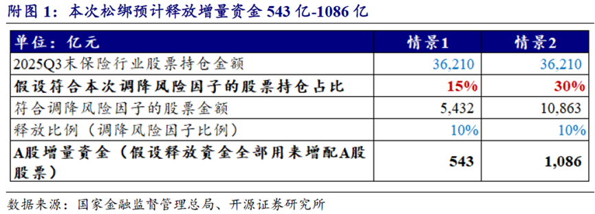 据开源证券测算,截至2025年3季度末,保险行业资产中股票规模3.62万亿,假设其中符合本次调降风险因子条件的股票占比15%-30%,则预计释放可增量资金543-1086亿元。