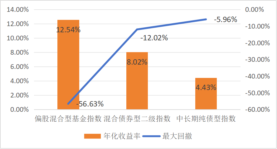 数据来源:Wind,统计区间:2004.1.1至2026.1.11;偏股混合型基金指数代码885001.WI、混合债券型二级指数代码885007.WI、中长期纯债型指数代码885008.WI。