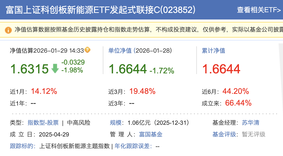 在此背景下,我上周上车了$富国上证科创板新能源ETF发起式联接C(OTCFUND|023852)$,这个基金是跟踪上证科创板新能源主题指数,重仓固态电池、钙钛矿、太空光伏等前沿方向,成分股多为高研发投入、高成长性的科创板“小巨人”,市值小、主题敏感度高,具备显著弹性优势。数据显示,该基金近1月上涨+14.12%,近6月涨幅达+44.20%,反弹动能强劲。