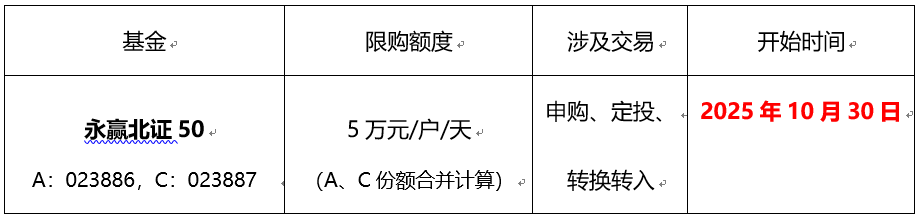 为保证基金平稳运作,永赢北证50成份指数基金自2025年10月30日起的基金申购、定投、转换转入业务,将会受到单日5万元/户的限制。需要注意的是2025年10月29日15:00后提交的基金交易申请将视为2025年10月30日的交易申请,同样受上述暂停大额申购限制。