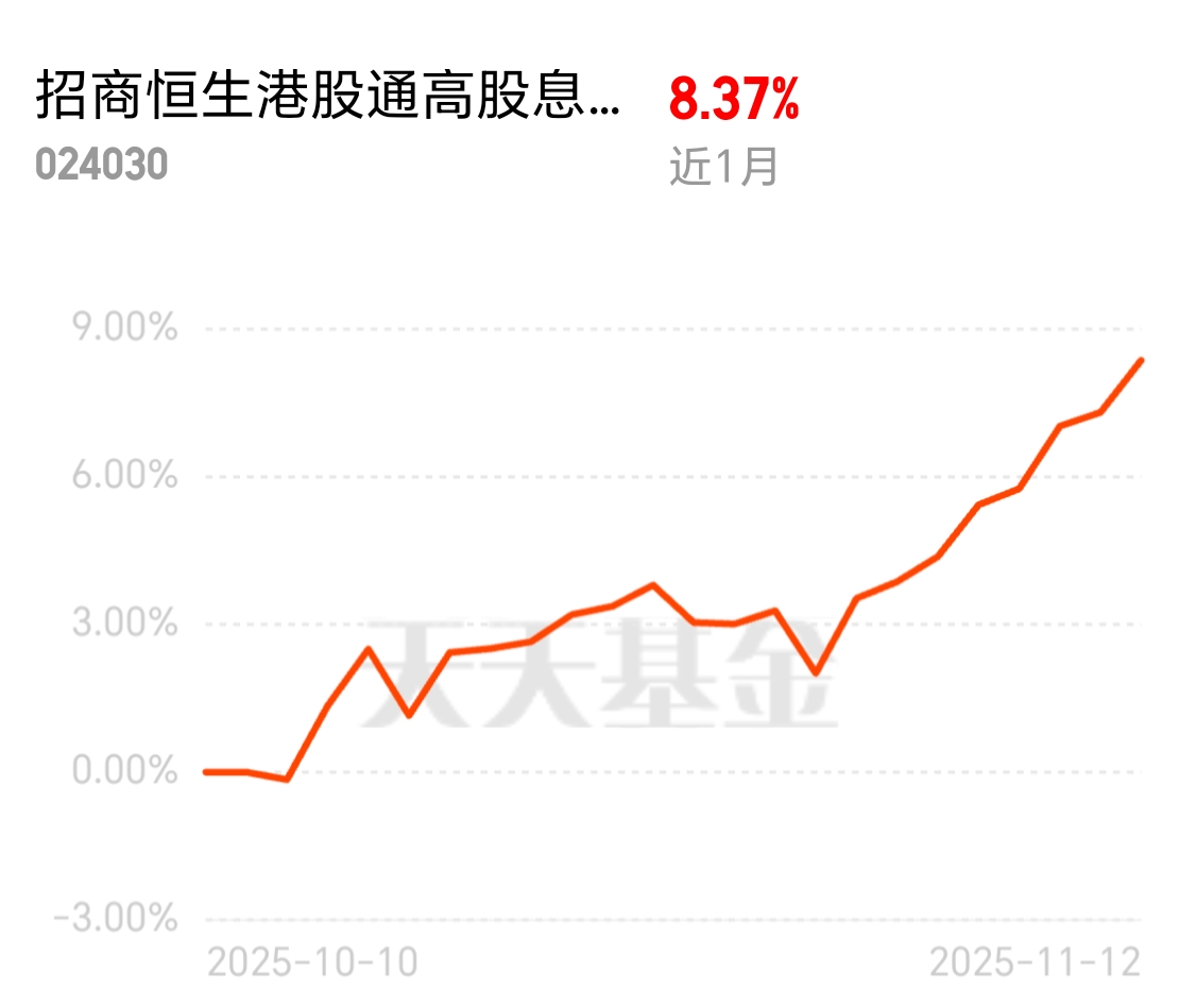 当下大家都追求稳健投资,不想冒太大风险还想有不错回报,高股息赛道正合适。招商恒生港股通高股息低波动ETF联接C近3个月收益5.08%,跟踪的指数金融地产占比超60%,6%高股息率很诱人,低波动还定期分红,低费率持有更省心。$招商恒生港股通高股息低波动ETF发起式联接C$
