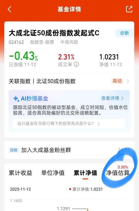 别盯着大盘股发愁了,近期北证这样的小盘股才是王者,$大成北证50成份指数发起式C$ 盘中估值涨超3个点,额度充裕,7天免赎回