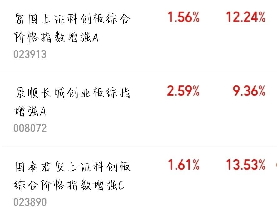 基金市场的实时态势一直在动态调整,各类基金净值有涨有落、起伏不定,不同板块的表现分化仍然明显。若想了解当下哪些基金势头正好、表现抢眼,哪些又暂时放慢节奏、动力稍弱,继续往下看,这些情况就能轻松搞明白了。$国泰君安上证科创板综合价格指数增强C$ 上涨了1.61%$景顺长城创业板综指增强A$ 上涨了2.59%$富国上证科创板综合价格指数增强A$ 上涨了1.56%