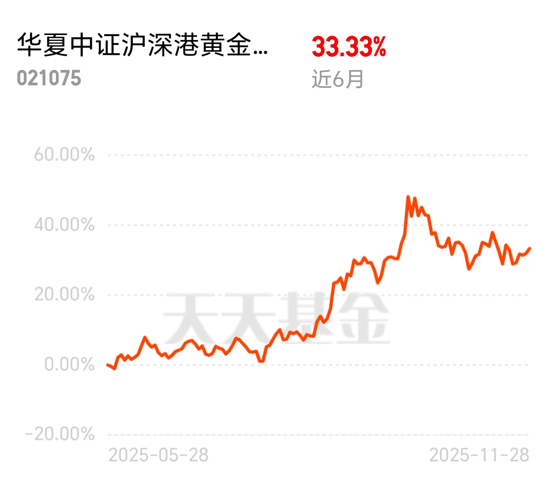 资源类题材表现优异,黄金也不错,这基当前涨幅上扬3%+,近6个月上涨33.33%,近一年收益达67%,$华夏中证沪深港黄金产业股票ETF发起式联接C$得拿牢