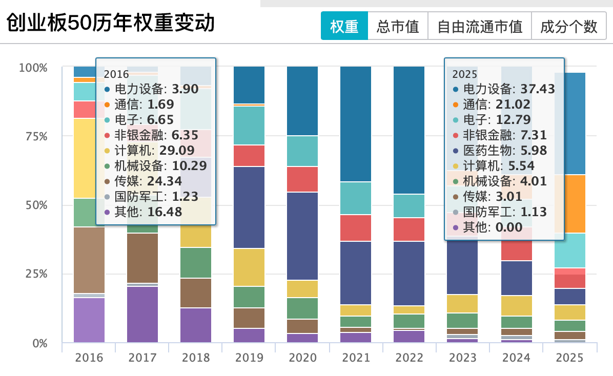 2016年末,前三大权重行业依次为:计算机、传媒、机械设备;2025年Q3末依次为:电力设备、通信、电子。从2016年“互联网+”浪潮下的计算机与传媒,到如今的新能源与硬科技主导的电力设备、通信与电子,创业板50每一次权重更迭,都精准踩中了时代心跳的节拍。