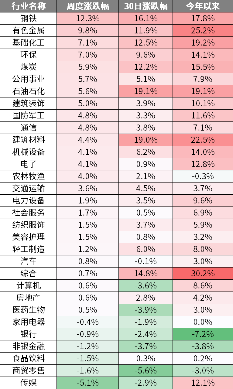 本周申万一级31个行业涨多跌少,钢铁、有色金属、基础化工和环保等板块涨幅靠前,传媒、商贸零售、食品饮料和非银金融等板块跌幅靠前。
