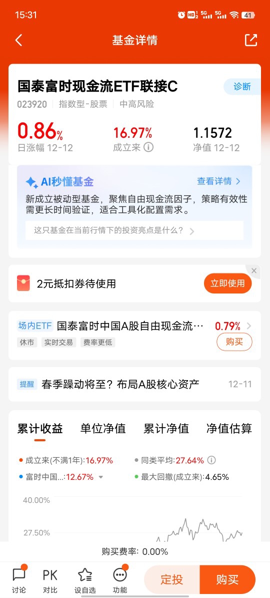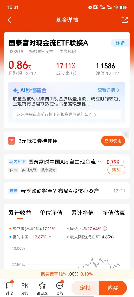 打卡第六天,$国泰富时现金流ETF联接C$ 本周下跌1.62%,于2025年4月29日成立,成立至今上涨16.97%,自由现金流指数场外基金也是从今年开始才成立的,据回测数据近十年上涨了3倍多,而且该指数的长期收益率要比红利指数高。风险要比市场大多数股基低,是一个性价比超高的指数。@国泰基金