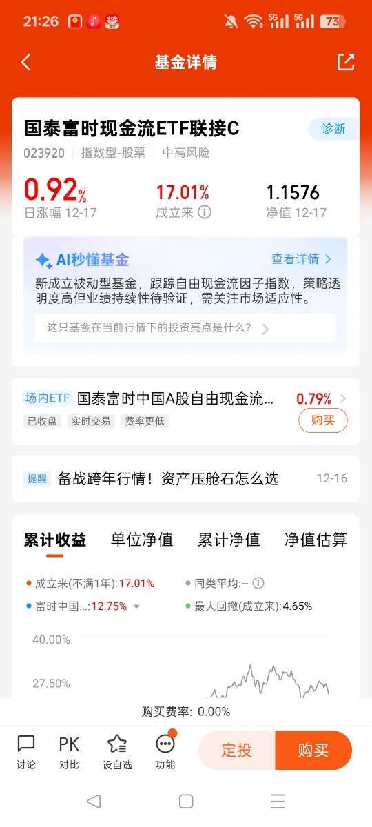 #观点搭子团火热招募中!# $国泰富时现金流ETF联接C$ 最新净值 1.1576,日涨 0.92%。上涨得益于 A 股回暖,且其跟踪的指数聚焦高现金流、稳分红的央国企及多行业龙头,这类标的在震荡市抗跌性强,还能借行业轮动获支撑。不过该基金近 1 个月跌 3.49%,短期仍有波动。