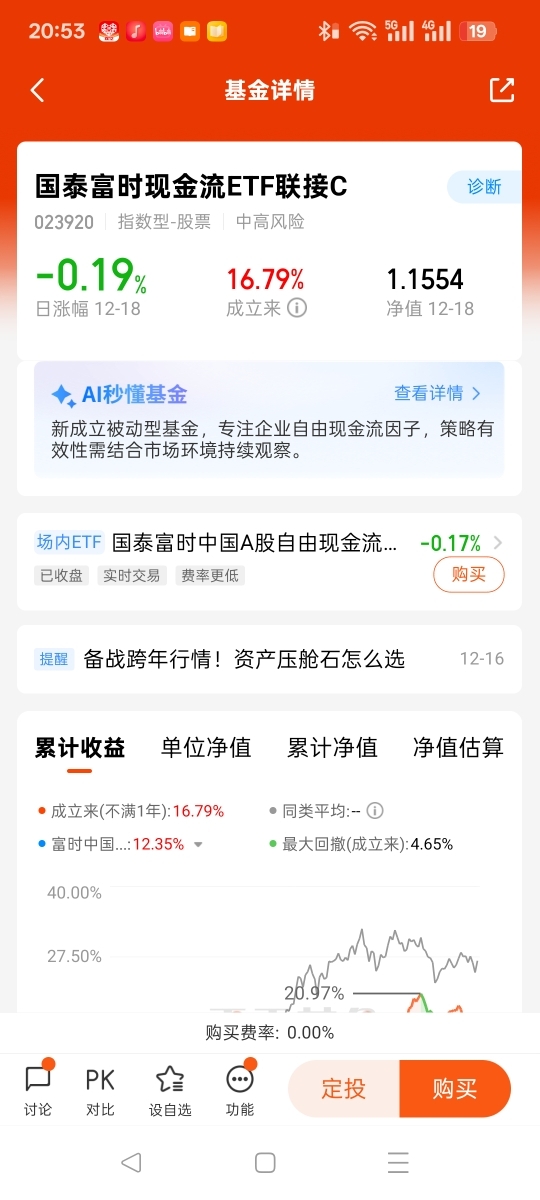 #观点搭子团火热招募中!# $国泰富时现金流ETF联接C$ 今日净值1.1554,日跌0.19%,算是小幅回调。主要是市场震荡下,部分资金暂时兑现收益,好在它跟踪的指数长期跑赢沪深300,成分股都是现金流稳定的央国企,抗跌性还行。我觉得这种回调不用慌,毕竟低利率环境里,高现金流、稳分红的资产本就稀缺。个人计划继续持有,要是后续单日跌幅超2%就小额定投加仓。C类免申购费,持有久了还免赎回费,很适合咱们普通投资者做长期布局。@国泰基金