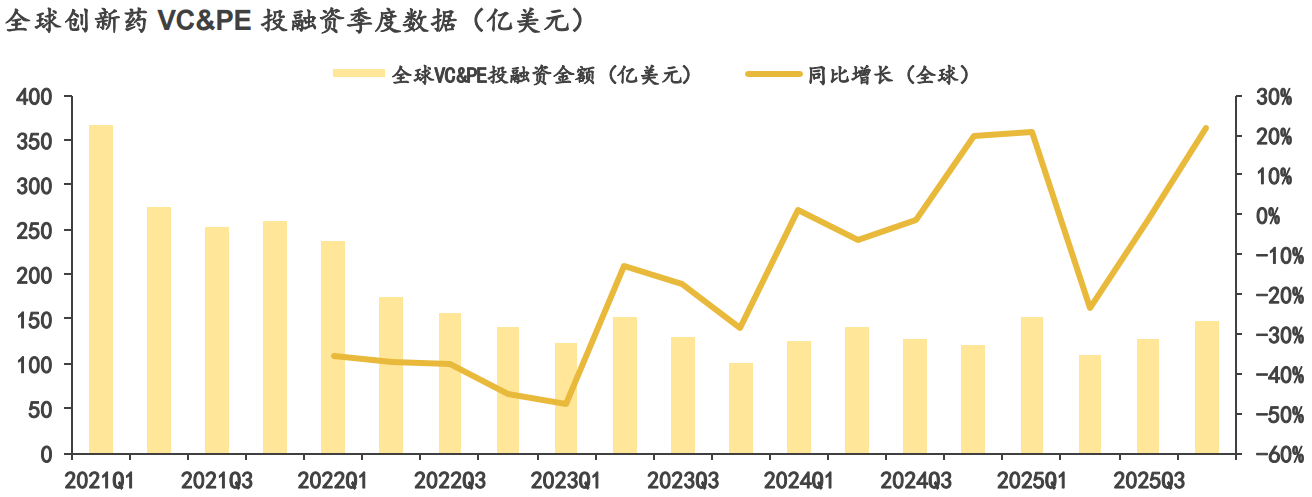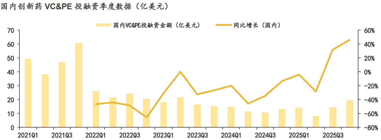 再看市场资金的态度,资本的嗅觉永远是最灵敏的。Crunchbase的数据显示,2025年四季度全球和国内创新药领域的VC&PE投融资金额,同比分别增长了22.05%和46.34%,而且增速比三季度还分别提升了23.59和13.97个百分点。这意味着不管是全球资本还是国内资本,都开始重新聚焦创新药赛道,资金的持续流入肯定会给板块带来估值修复的动力。加上2026年一季度还有JPM大会这样的行业盛会,到时候企业的商业化进展、海外授权的里程碑付款都会密集落地,这些都是实打实的股价催化剂。
