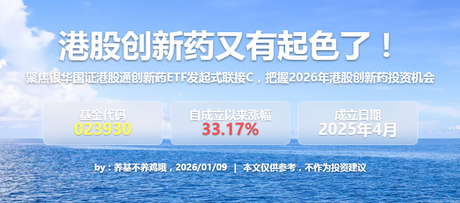 2026年的港股创新药板块,既有出海、投融资、政策三大基本面的共振支撑,又有估值修复的空间,投资机会已经非常清晰。而银华国证港股通创新药ETF发起式联接C(023930)凭借优异的业绩、扎实的持仓、专业的管理和亲民的费率,刚好为我们普通人提供了一个低门槛、高效率把握这波机会的工具。